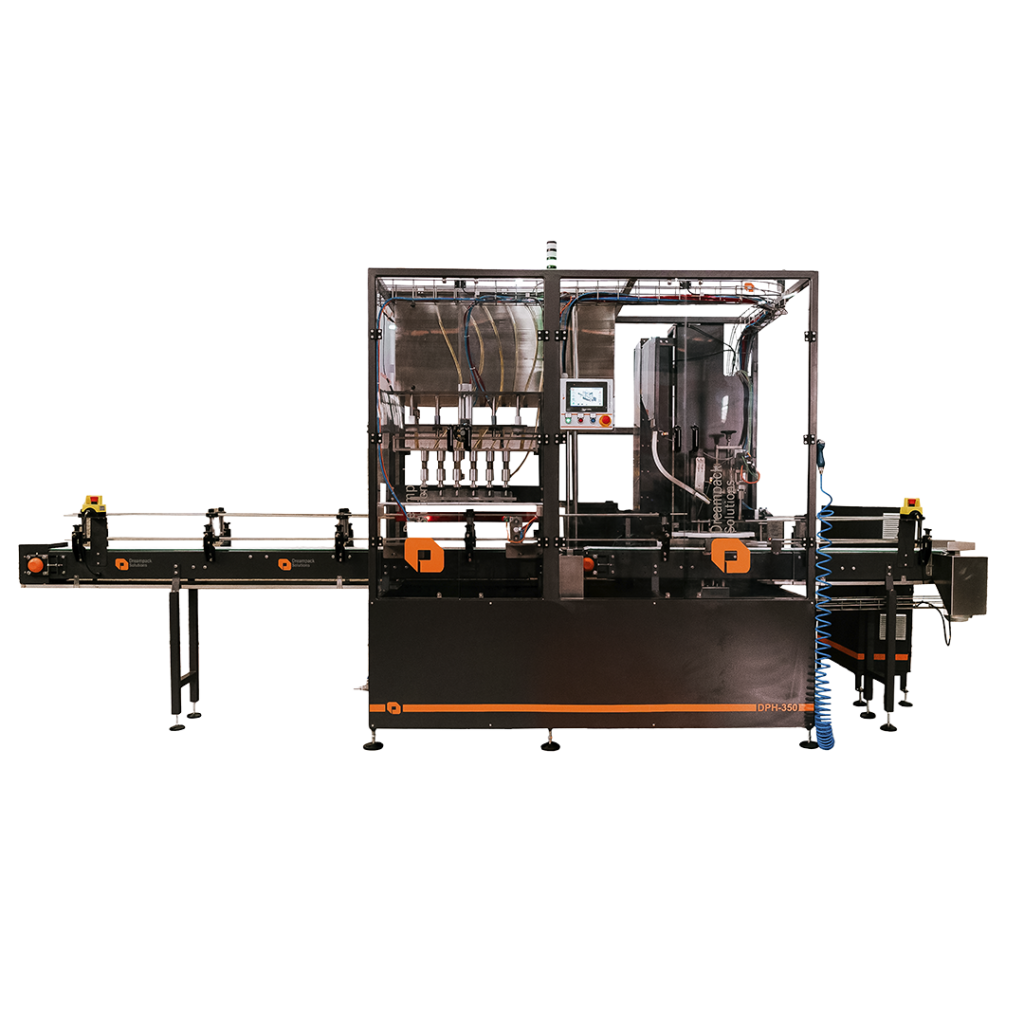 Envasadora linear, ideal para envase em frascos, garrafas, potes, galões e similares. Equipamento com múltiplos bicos de envase, ou via única, de acordo com o produto a ser envasado e sistema de dosagem utilizado.
